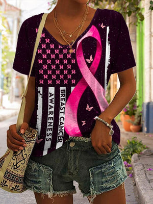 Breast Cancer Awareness Casual Butterfly Print T-Shirt