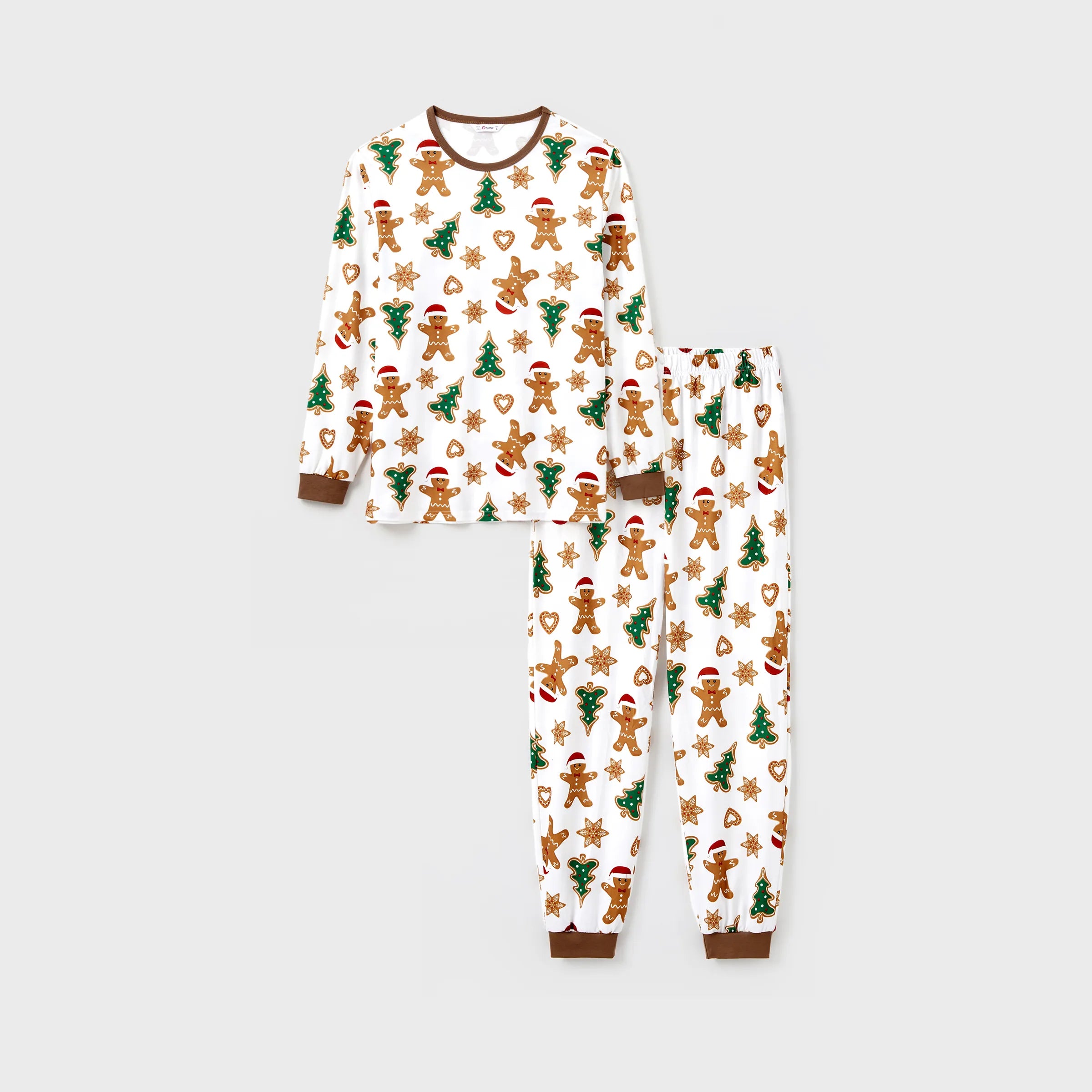 Christmas Family Matching Cartoon Gingerbread Man and Tree All-over Print Long-sleeve Pajamas Sets with Christmas Socks Coffee