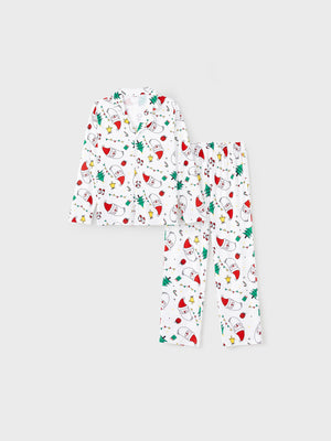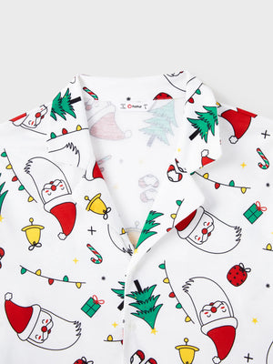 • Festive prints of Christmas lights, trees, and Santa Claus