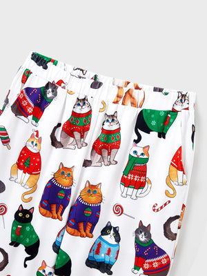 Festive family matching outfits with Christmas cat pattern.