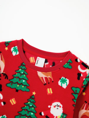 Festive red family pajamas with Christmas tree and Santa designs, ideal for Christmas pajama parties, family photos, and enhancing holiday spirit and family bonding.