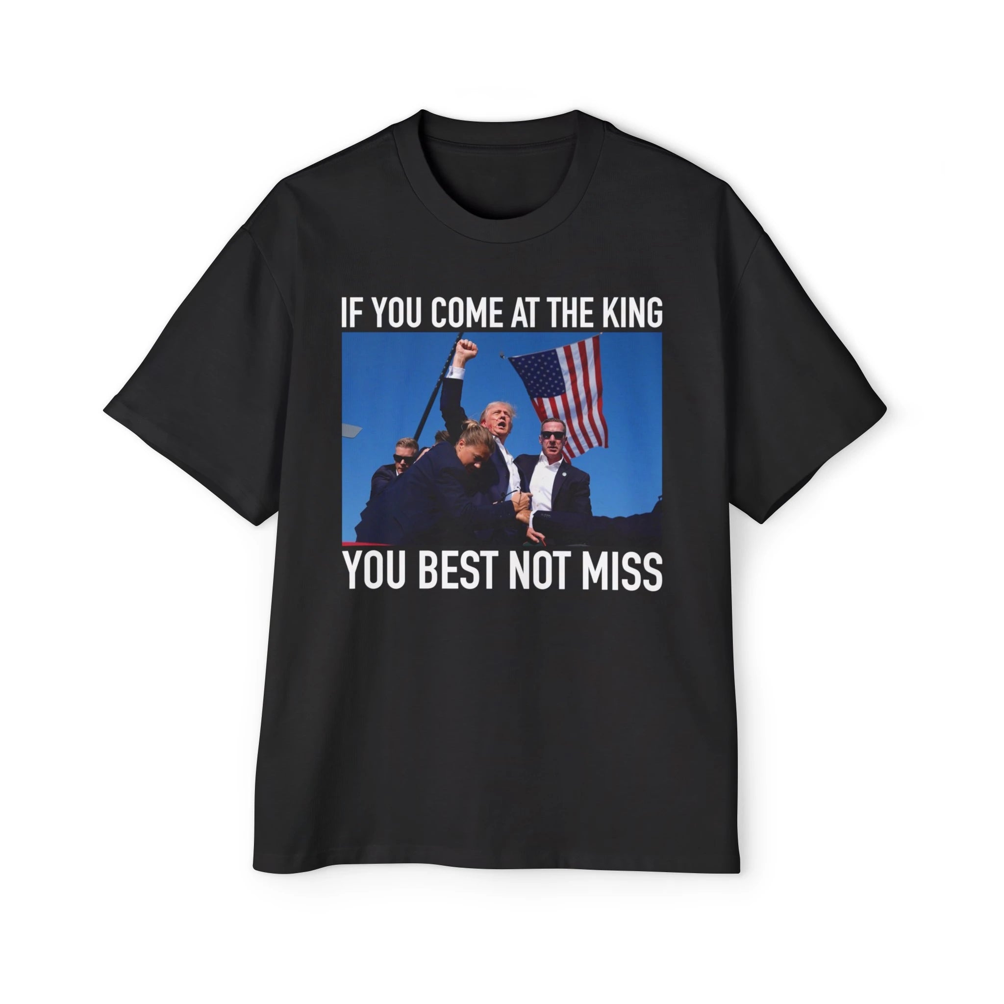 This shirt features a striking image of during the infamous Pennsylvania rally incident, accompanied by the powerful slogan “If You Come at The King You Best Not Miss.” It symbolizes resilience and a defiant attitude in the face of adversity, making it a perfect piece for those who appreciate sharp political commentary and satire.