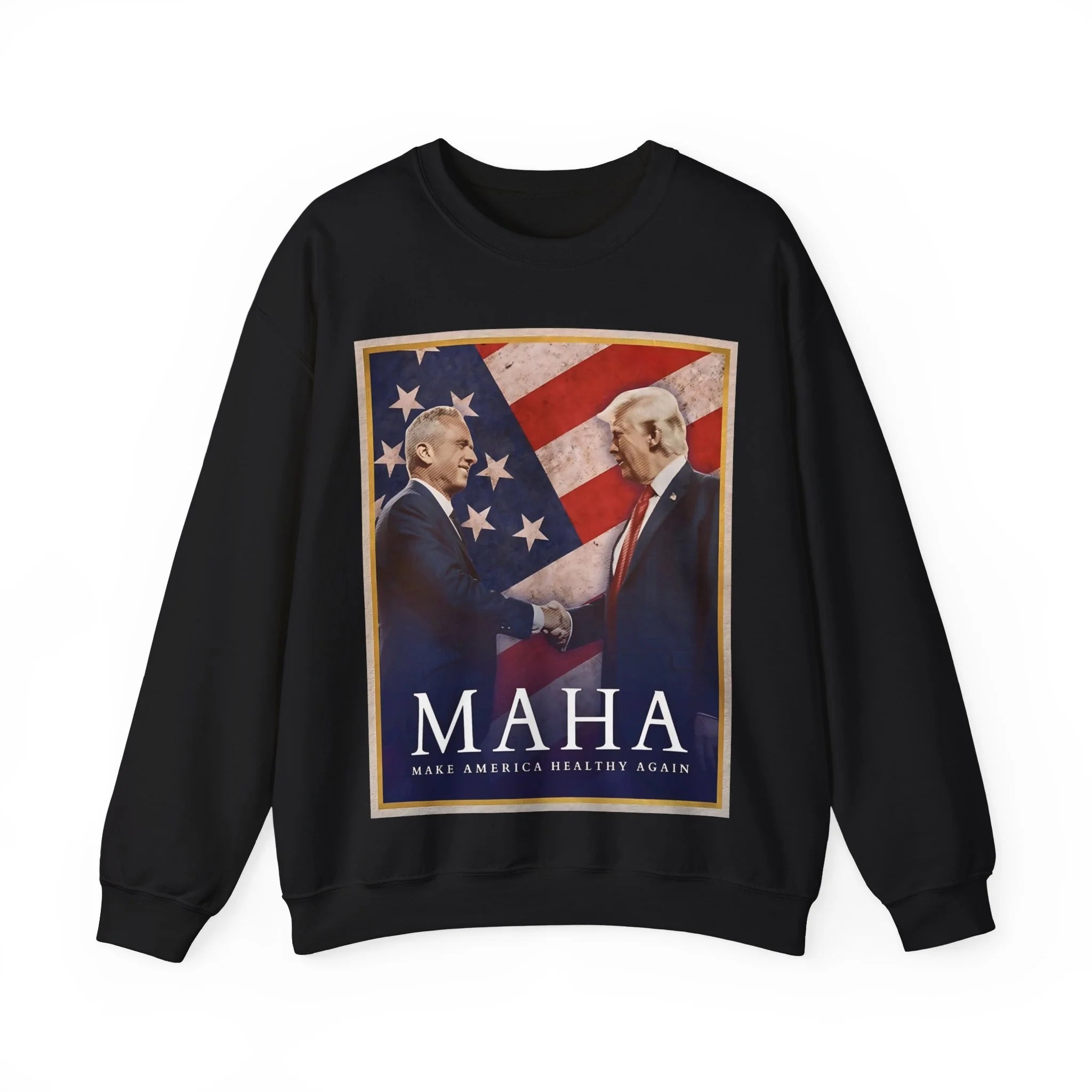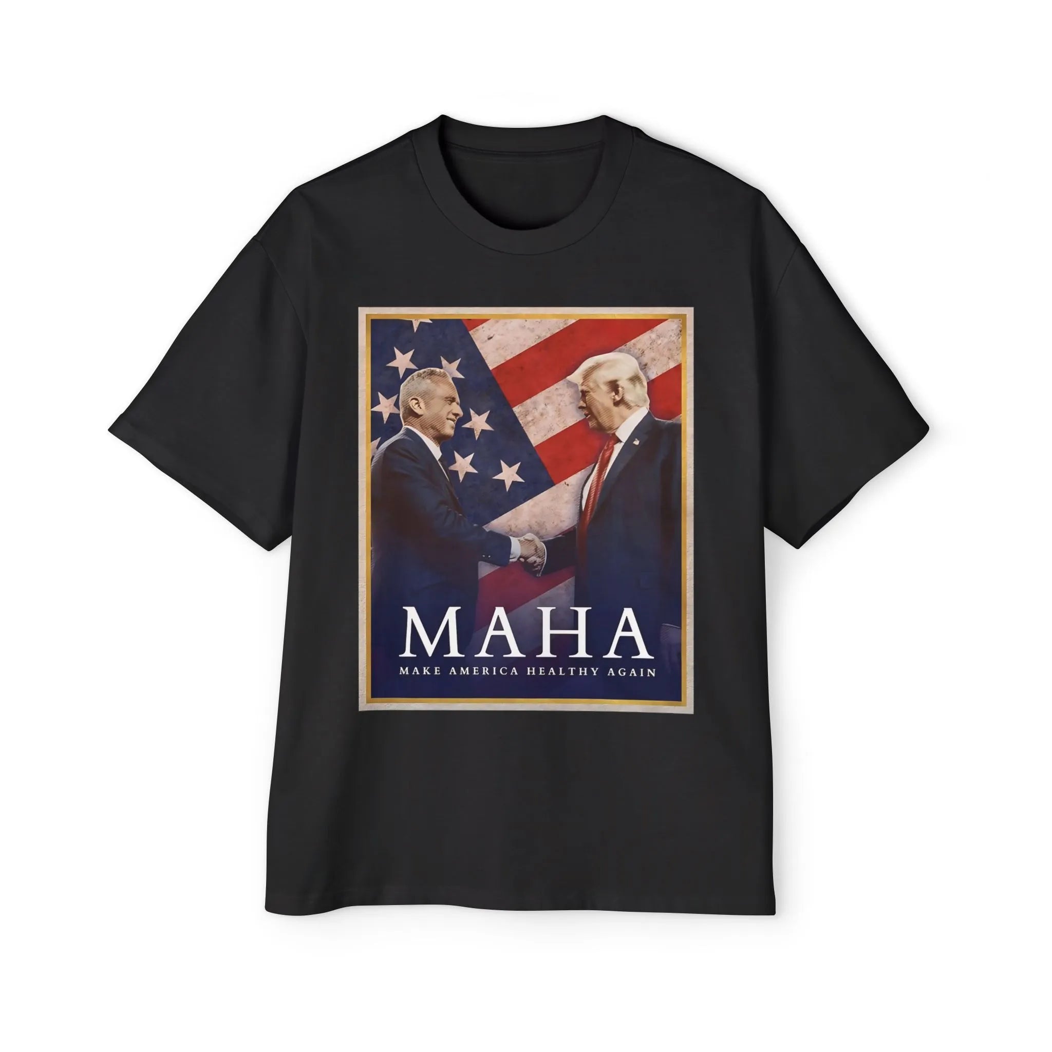 This shirt proudly showcases Donald Trump and  side by side, representing a blend of strong leadership and iconic American ideals. The bold “MAHA” slogan—Make America Healthy Again—is a fun twist on the famous phrase, encouraging a focus on improving health across the nation. With the stars and stripes of the American flag in the background, this design is a call for unity, strength, and progress.
