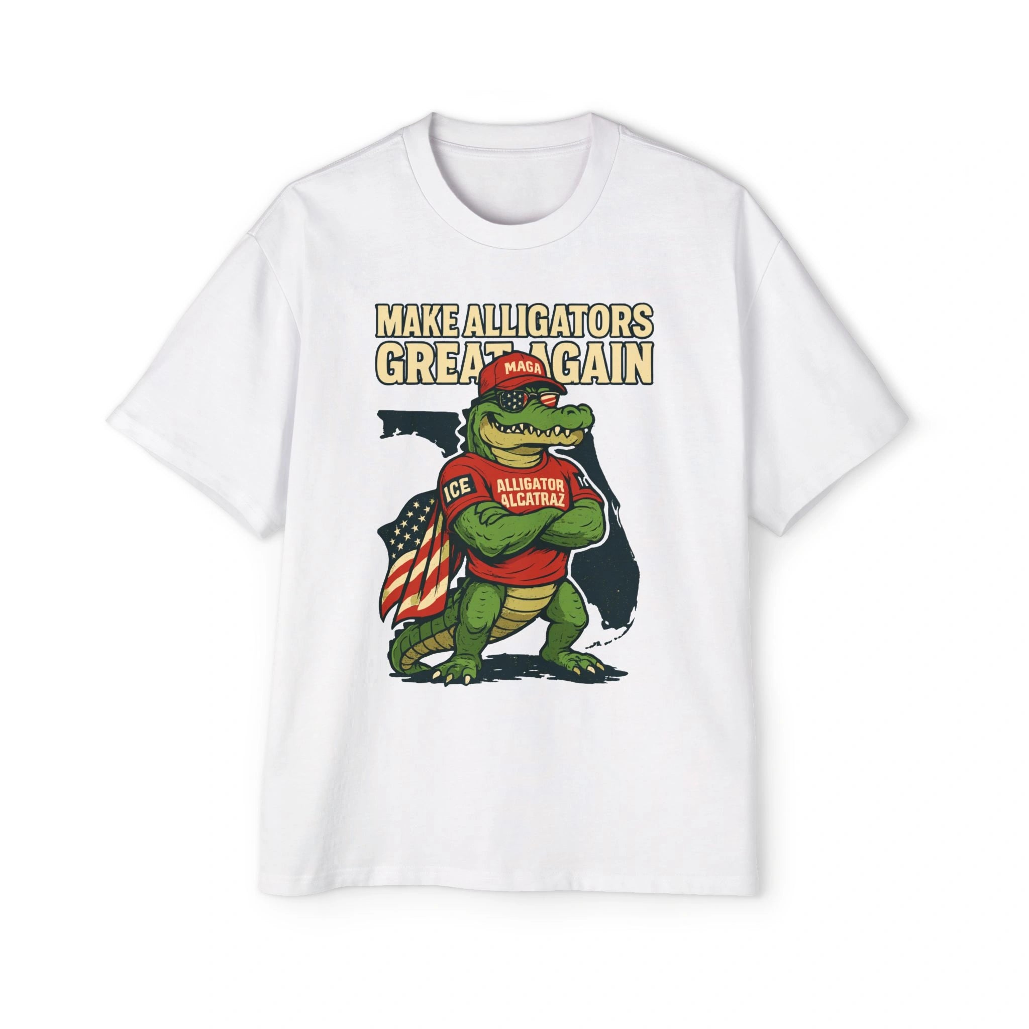This design went viral after Florida lawmakers—led by DeSantis and company—proposed detaining migrants in alligator-infested zones deep in the Everglades. That’s not a joke. The internet lit up, the memes took over, and then came the merch. First there were “” tees. Now we’ve got the MAGA Gator revolution.