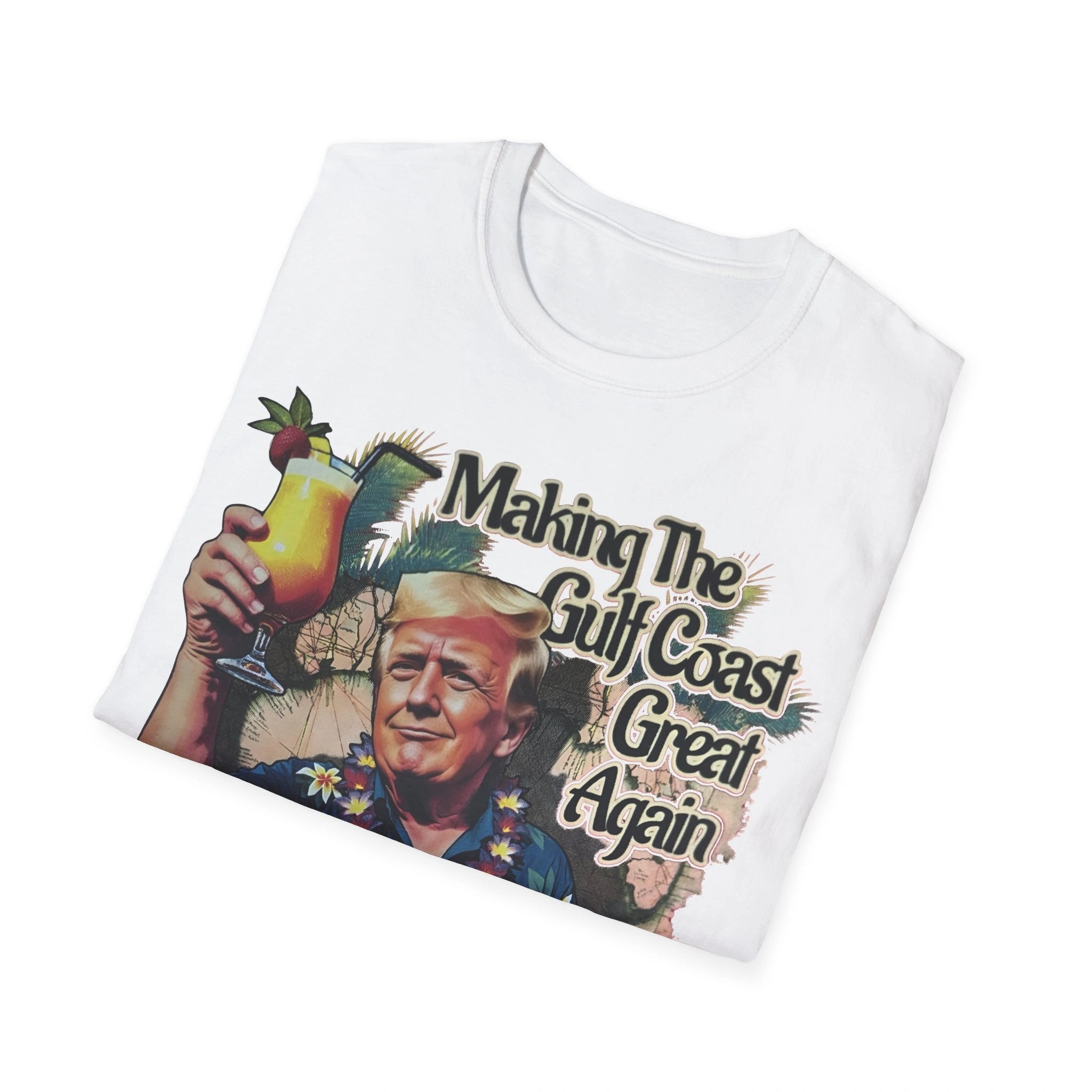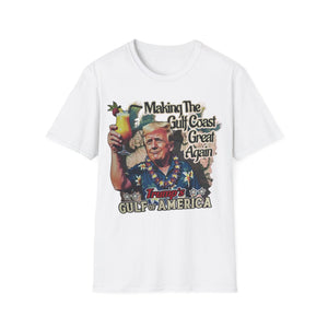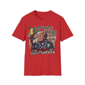 The Making The Gulf Coast Great Again Shirt is a bold fusion of patriotism, parody, and poolside swagger. Featuring like you’ve never seen him before—laid-back in a floral Hawaiian shirt, decked out in a lei, and raising a frozen cocktail—this design reimagines Gulf Coast politics with vacation vibes and unapologetic energy.