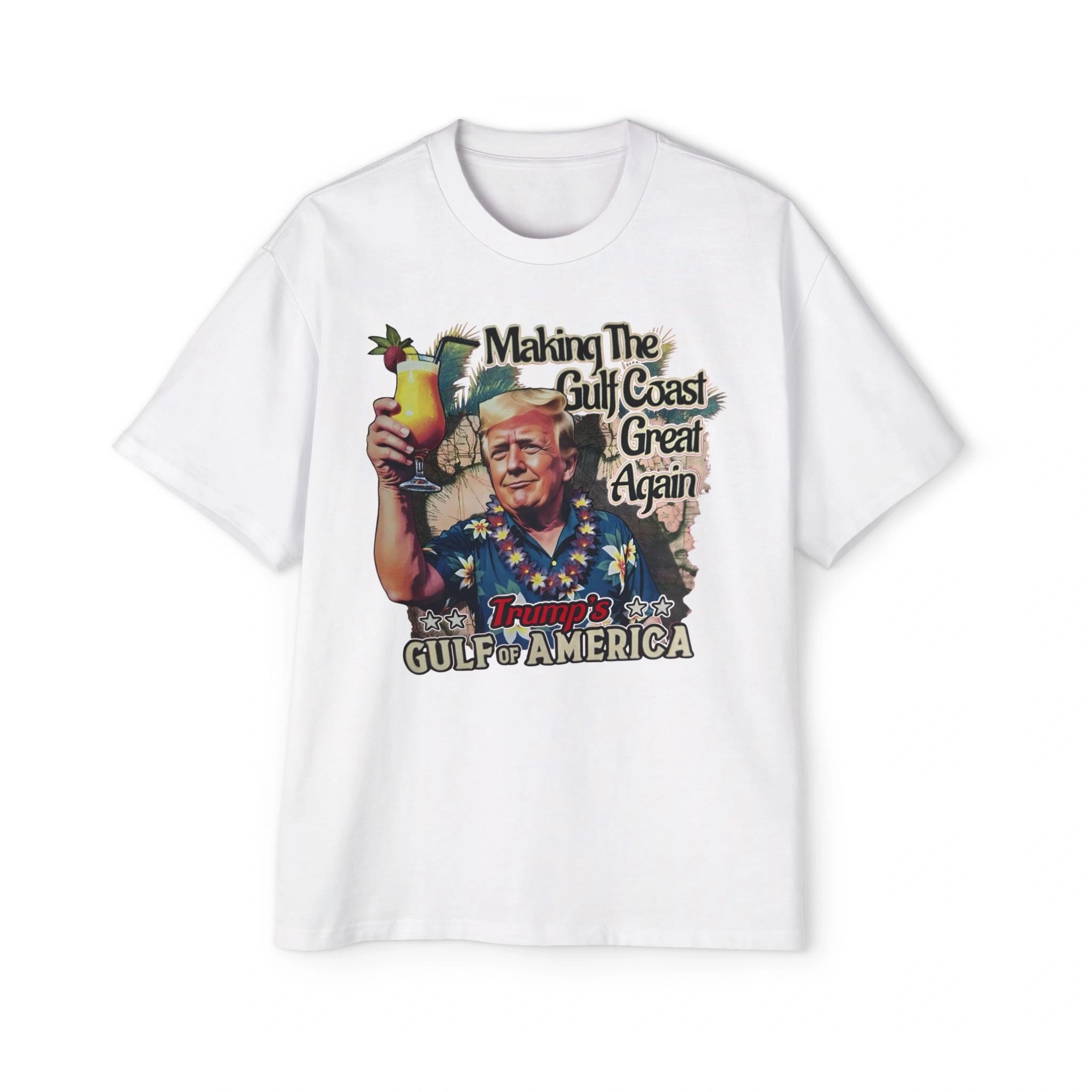 Front and center, the artwork showcases Trump in full beach-mode glory. Behind him, palm fronds and a vintage-style Gulf map set the backdrop, while oversized lettering reads “Making The Gulf Coast Great Again” in retro-faded script. Beneath that, ““ is etched in campaign-style typography with bold stars, making it feel equal parts tourism poster and campaign slogan.