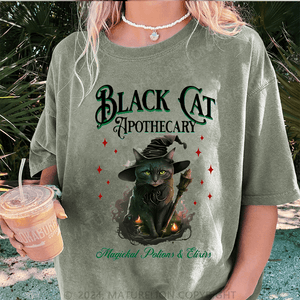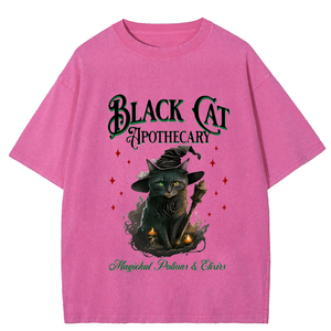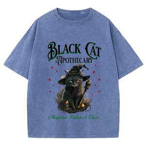 Maturelion Halloween Black Cat Apothecary Halloween Casual DTG Printing Washed Cotton T-Shirt
