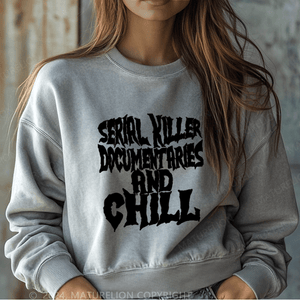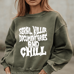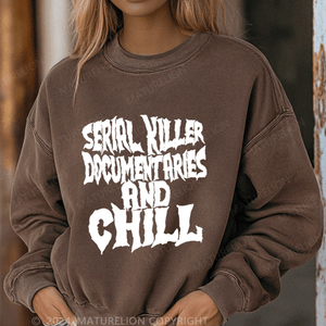 Maturelion Halloween Serirl Killer Documentaries And Chill Washed Halloween Sweatshirt