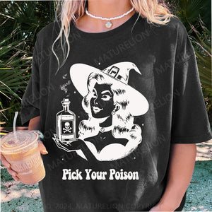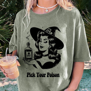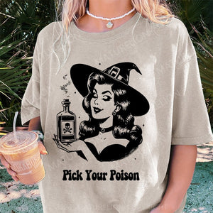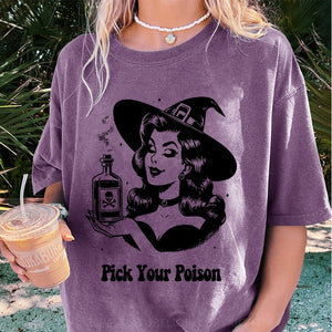 Maturelion Halloween Pick Your Poison Pin Up Witch Halloween Case DTG Printing Washed Cotton T-Shirt