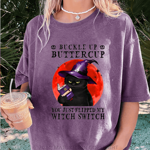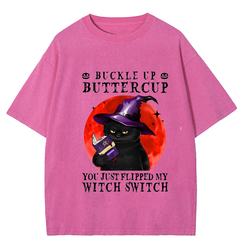 Maturelion Halloween Witch Cat Buckle Up Buttercup You Just Flipped My Witch Switch DTG Printing Washed Cotton T-Shirt
