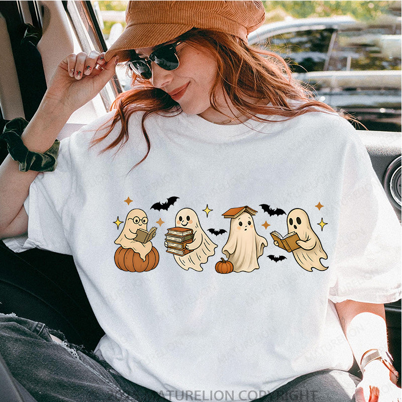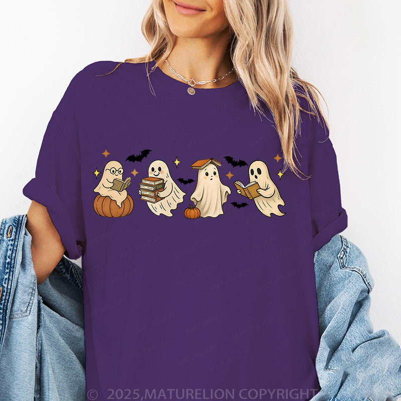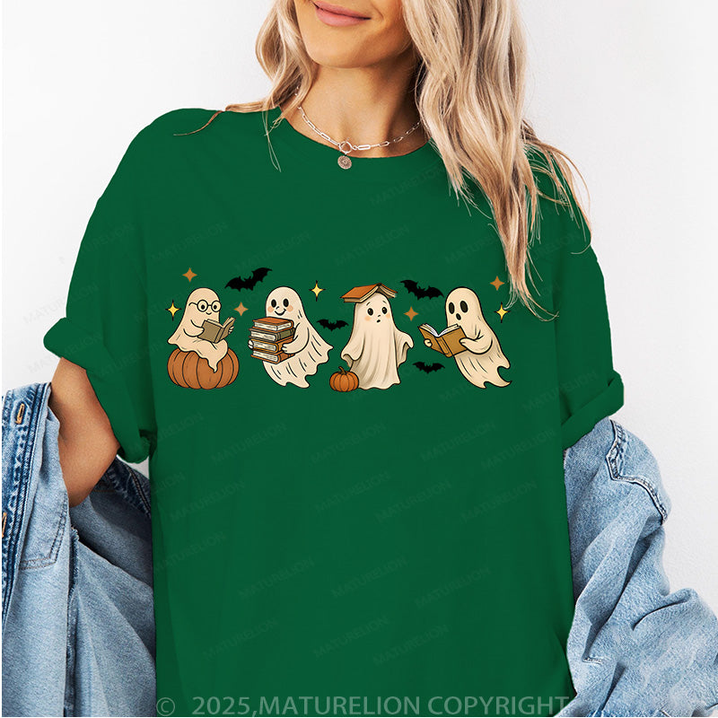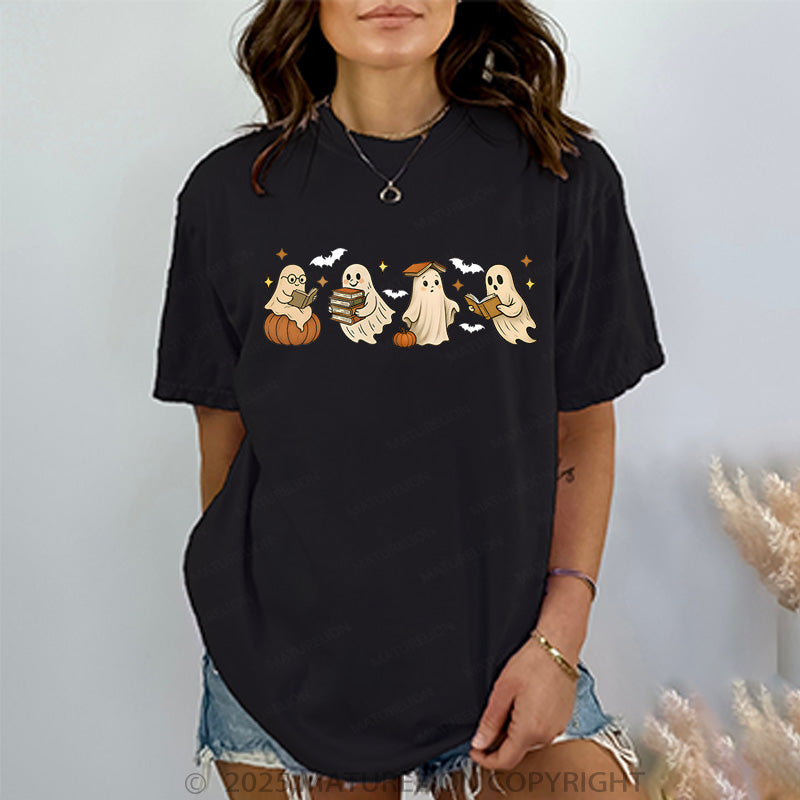 Maturelion Women's T-shirt Vintage Halloween Ghost Reading Books Cotton T-shirt