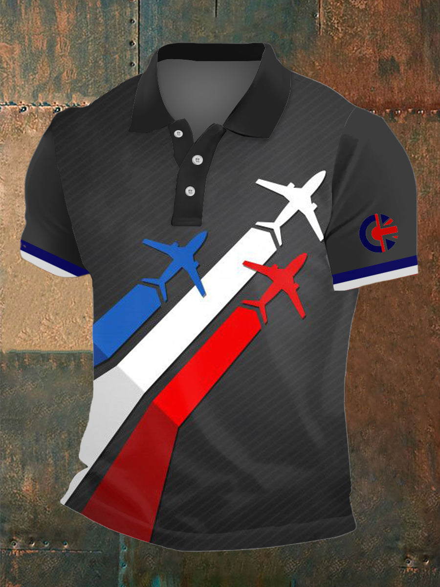Men's Aircraft Print Polo Neck Plunger Short Sleeve T-Shirt