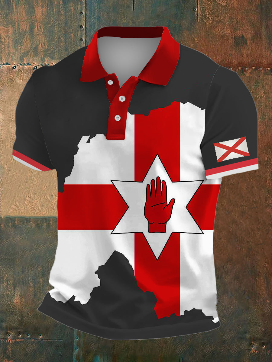Men's Map Of Northern Ireland And Ulster Flag Print Polo Neck Plunger Short Sleeve T-Shirt