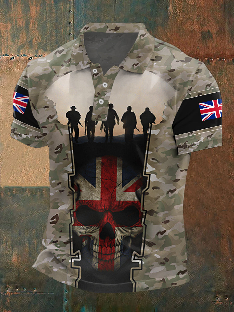 Men's UK Flag Camouflage Skull Print Casual Polo