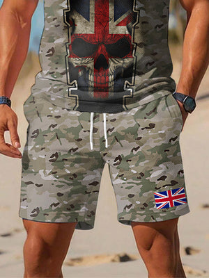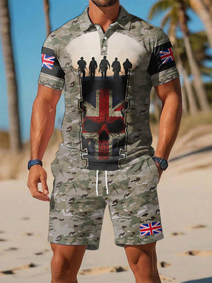 Men's UK Flag Camouflage Skull Print Casual Polo Two-Piece Set