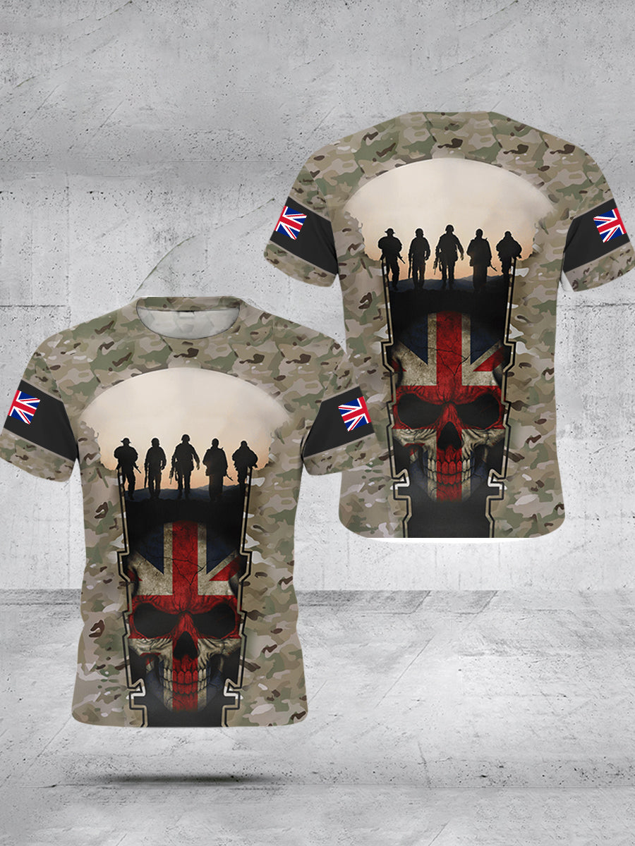 Men's UK Flag Camouflage Skull Print Casual Tee