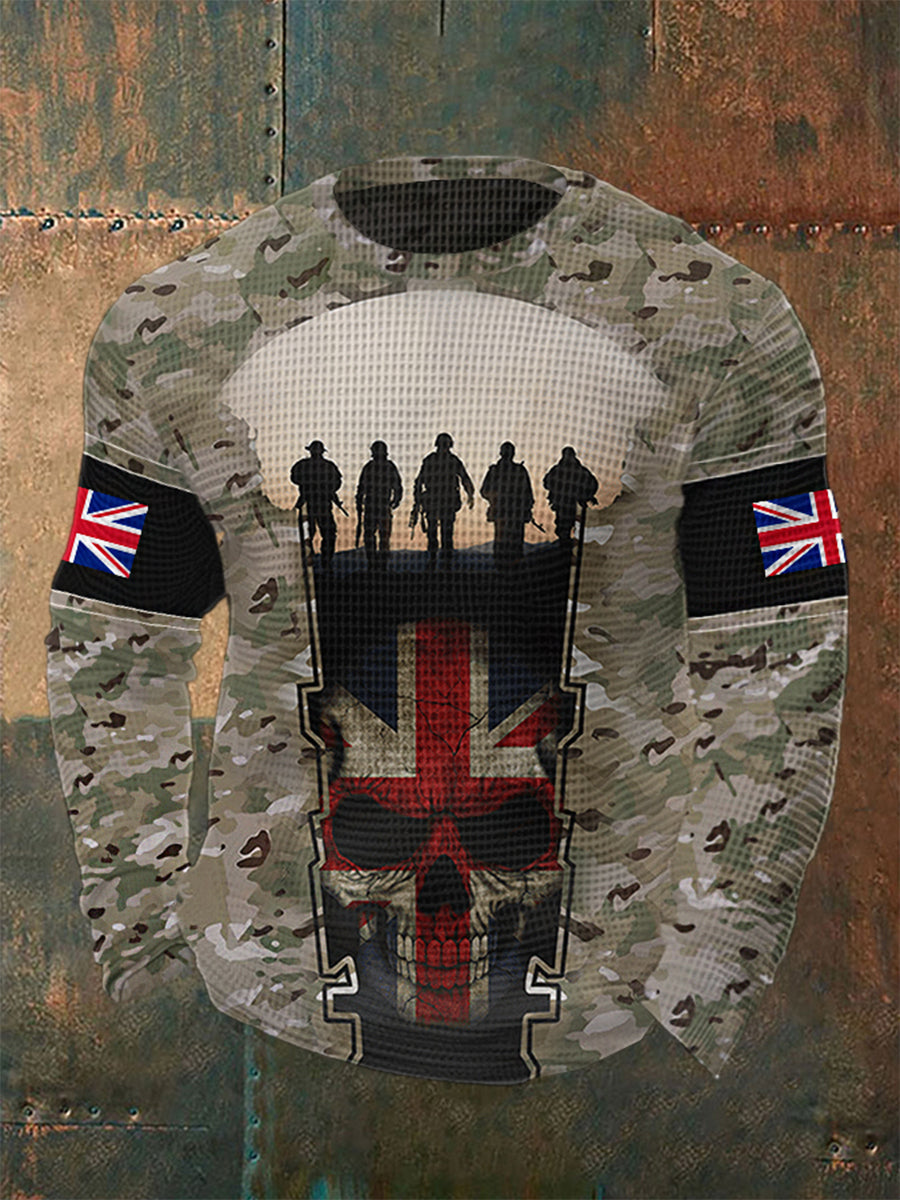 Men's UK Flag Camouflage Skull Print Casual Waffle Sweatshirt