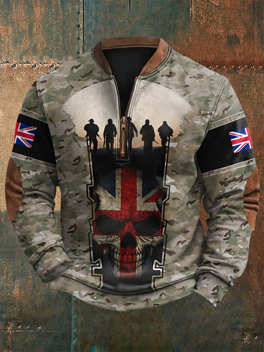 Men's UK Flag Camouflage Skull Print Casual Zipper Sweatshirt