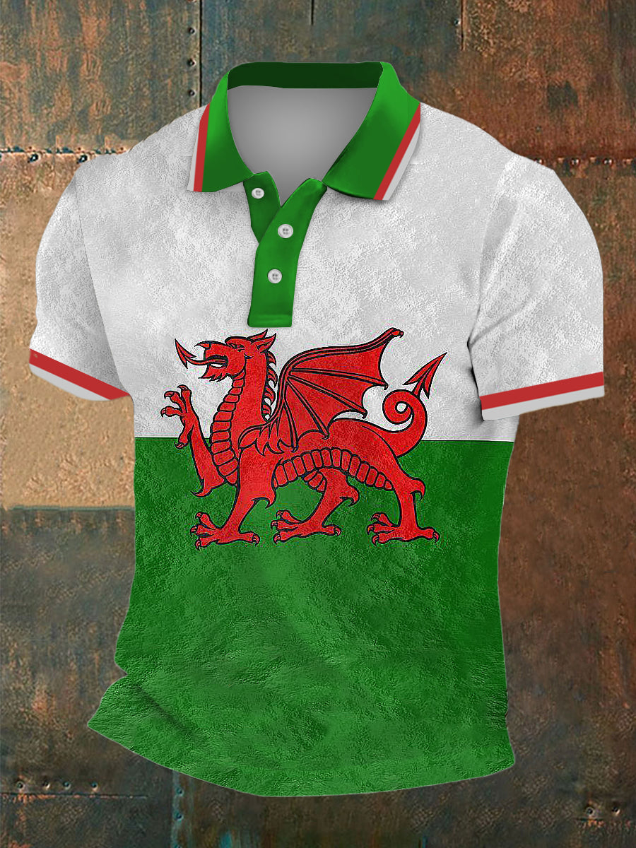 Men's Welsh Flag Print Polo Neck Plunger Short Sleeve T-Shirt
