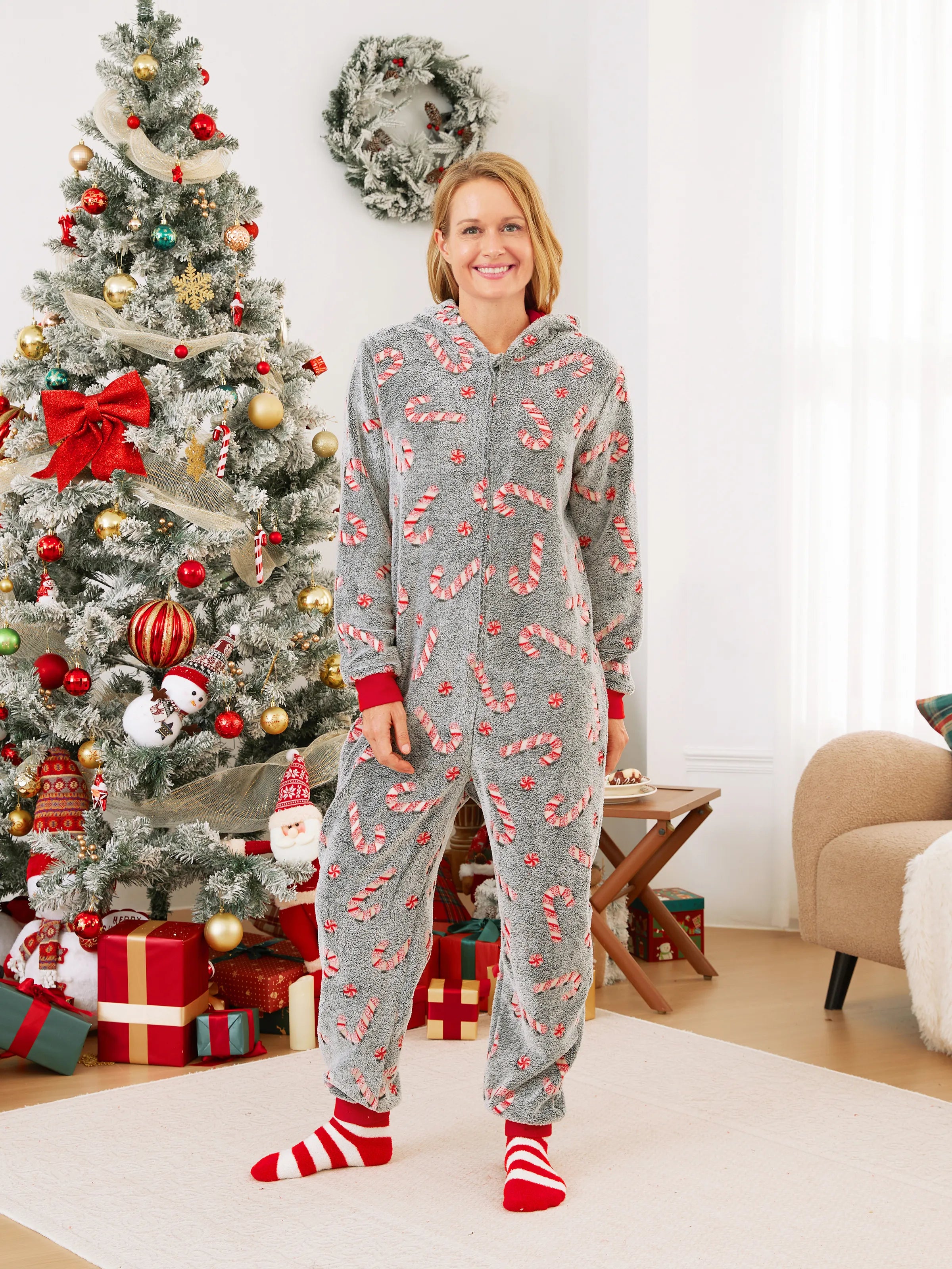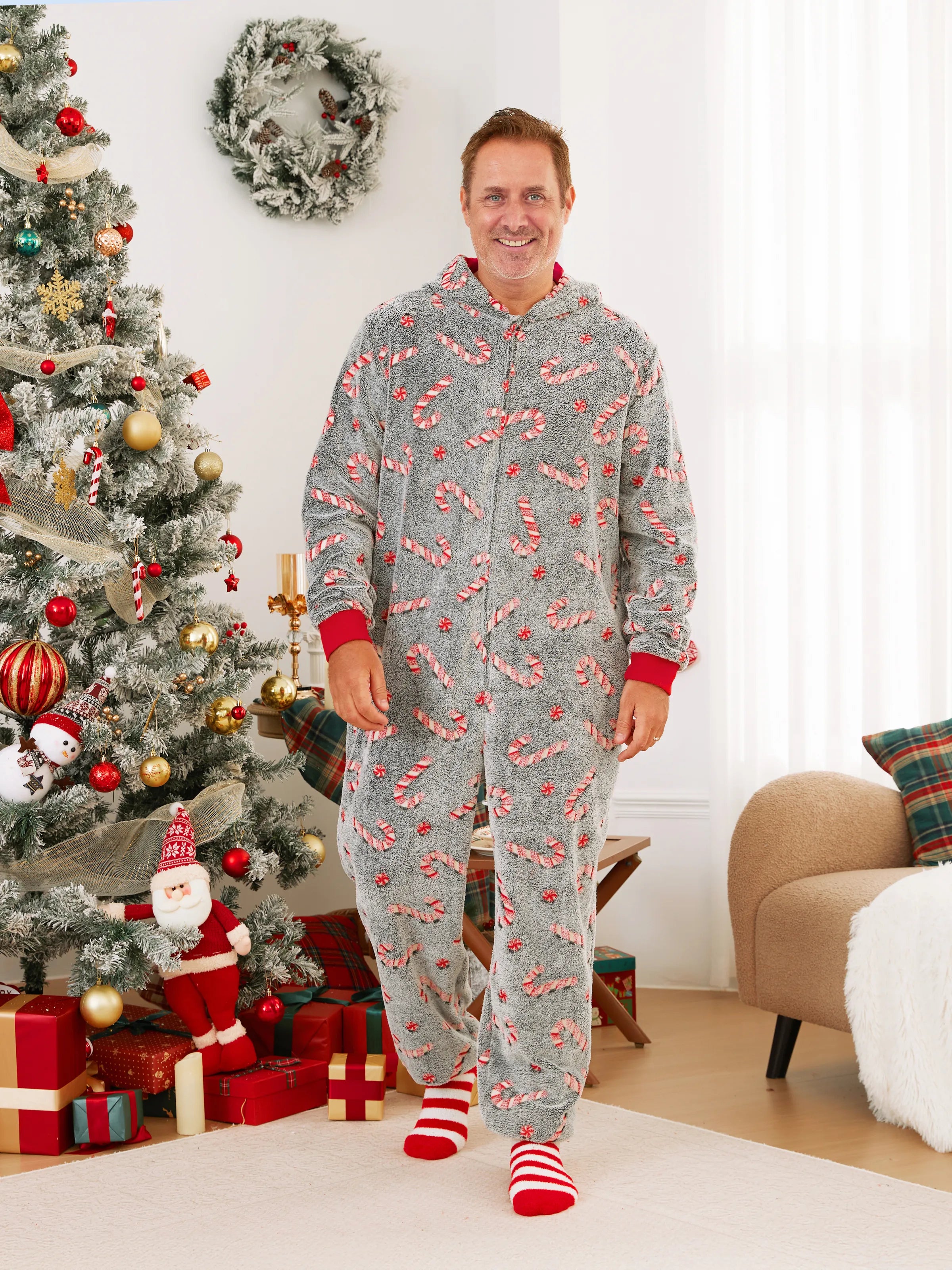 Onesies Pajamas Matching Christmas Outfits Candy Cane Pattern (Glow in the Dark) with Christmas Socks Black