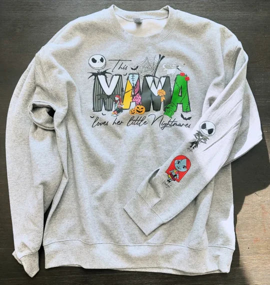 👻 Each sweatshirt features the phrase "This Mama loves her little Nightmares" with unique Halloween-themed letters and your choice of adorable spooky characters (inspired by Nightmare Before Christmas style). You can personalize it with up to 6 names, making it a perfect gift from kids or grandkids.