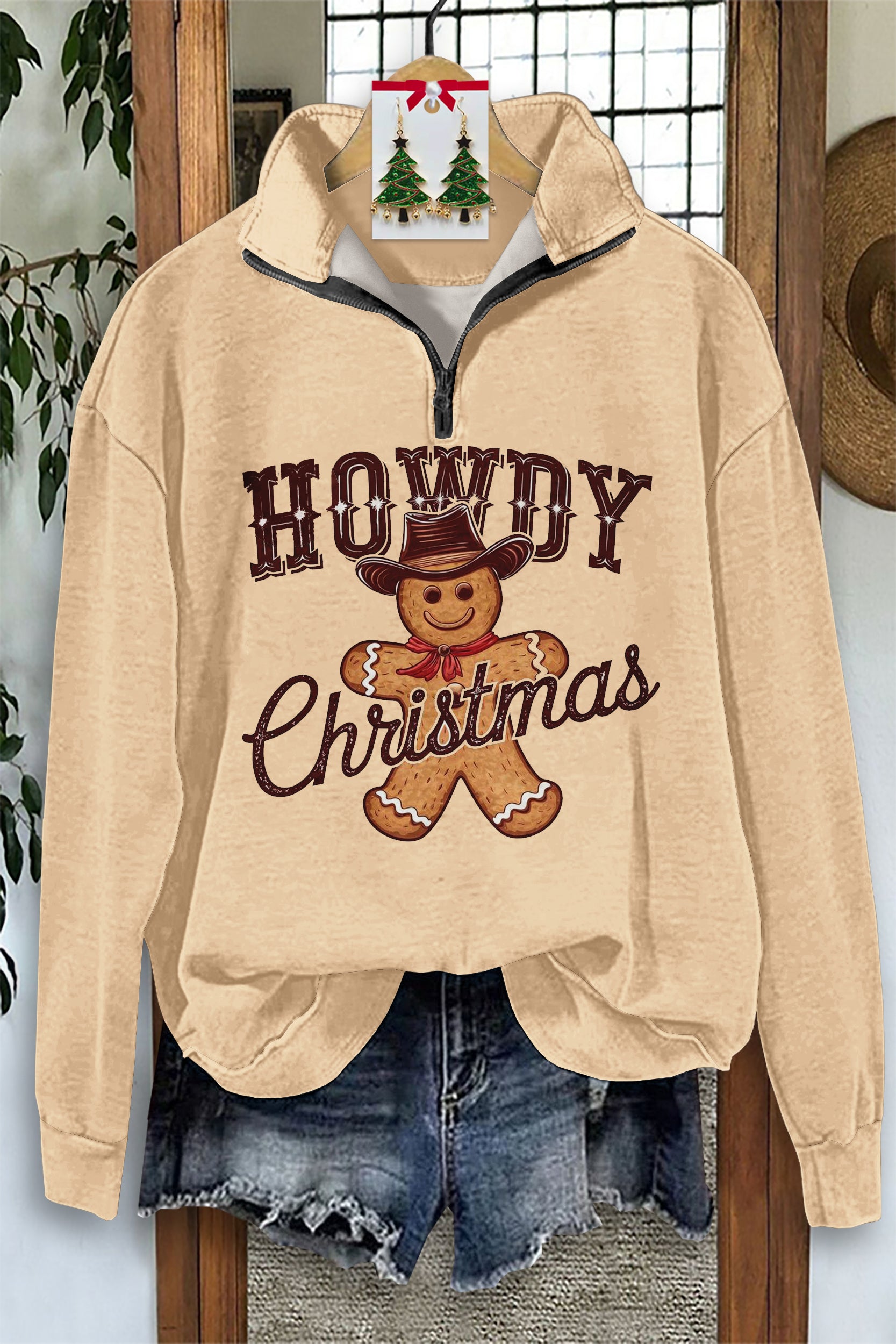Vintage Christmas Gingerbread Print Zip-Up Sweatshirt