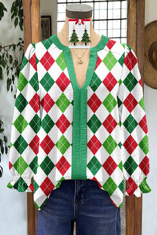 Christmas V-Neck Bell Sleeve Plaid Shirt