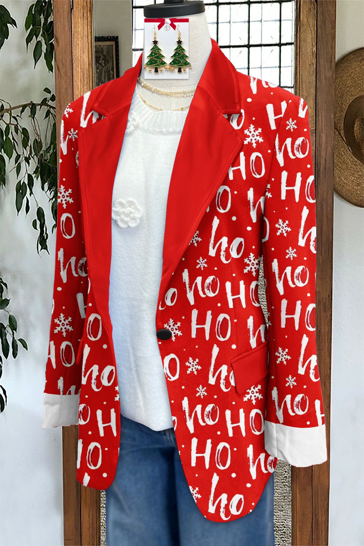Classic Christmas Print Long Sleeve Blazer