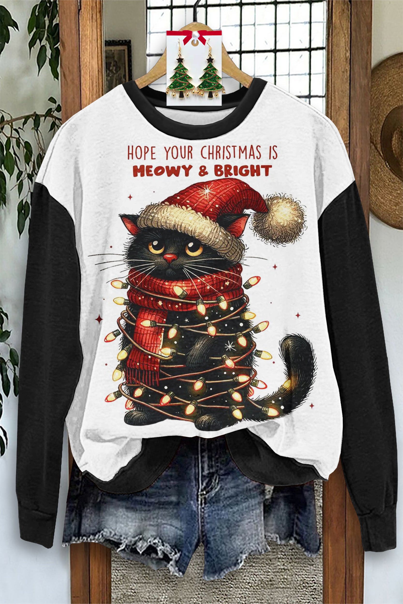 Cute Christmas Black Cat Print Long Sleeve Sweatshirt