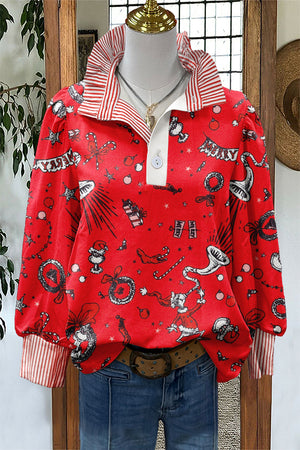 Classic Christmas Grinch Print Stripe Puff Sleeve Blouse