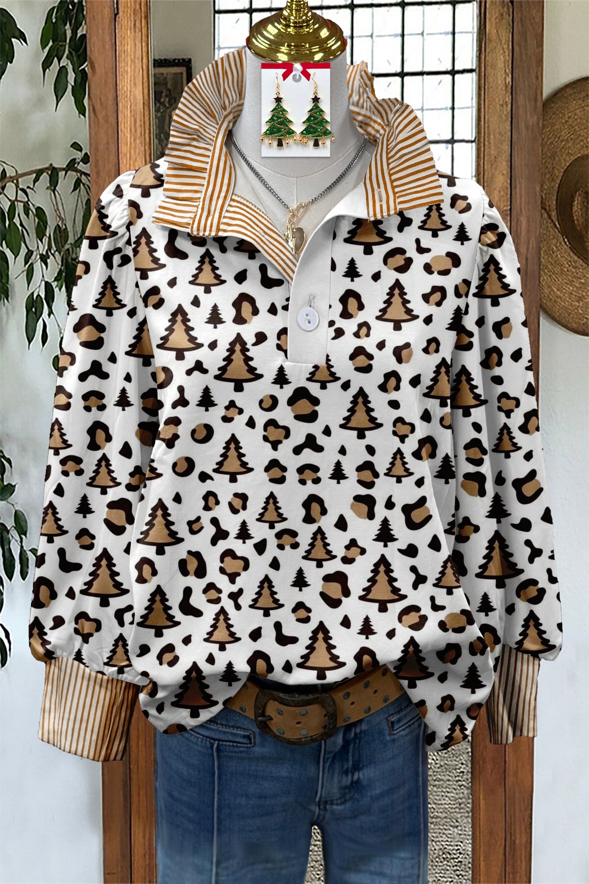 Leopard Christmas Tree Print Striped Stand Collar Blouse