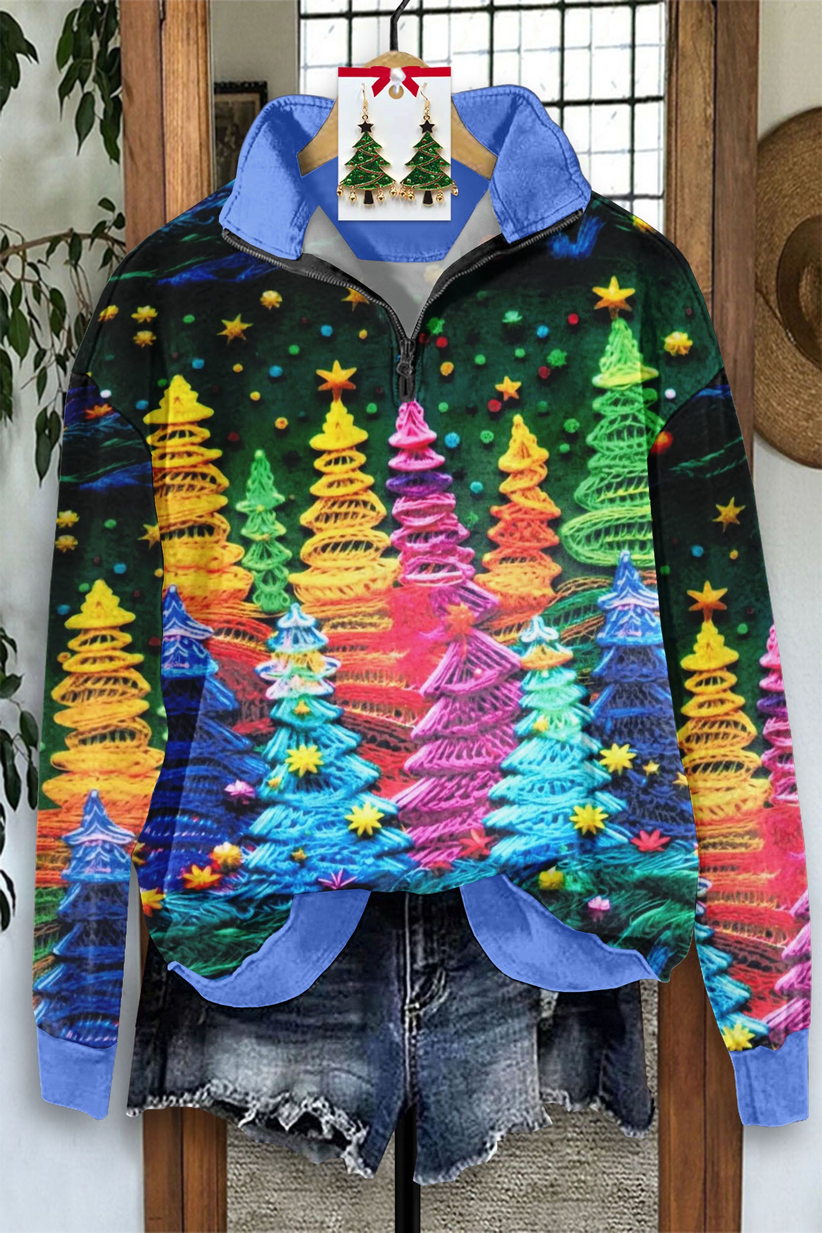 Vintage Christmas Tree Print Zip-Up Sweatshirt