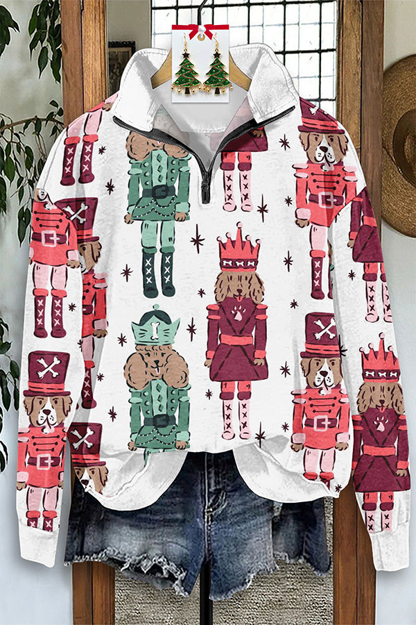 Vintage Santa Dog Nutcracker Print Zip-Up Sweatshirt