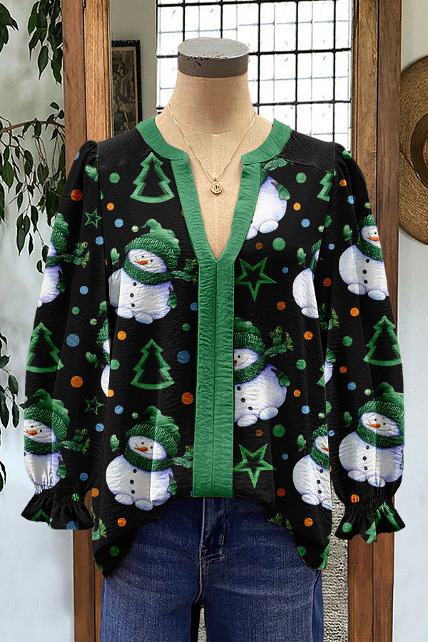 Cute Christmas Snowman Print Puff Sleeve Top