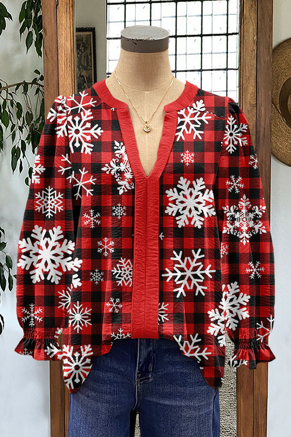 Classic Christmas Plaid Snowflake Print Puff Sleeve Blouse