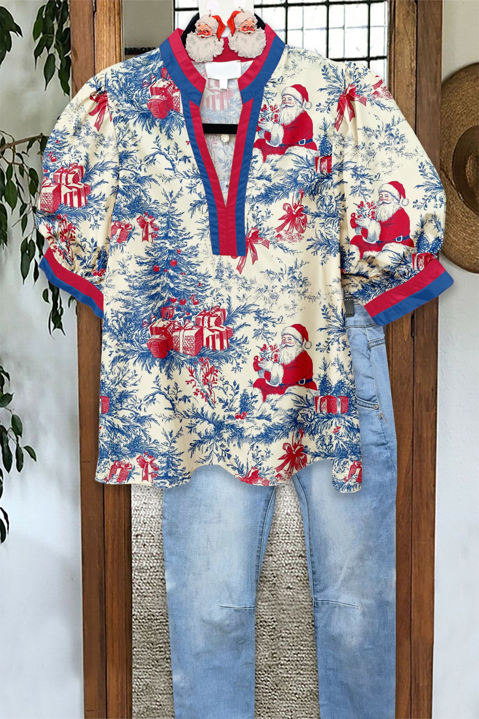Vintage Christmas Santa Claus Puff Sleeve Blouse