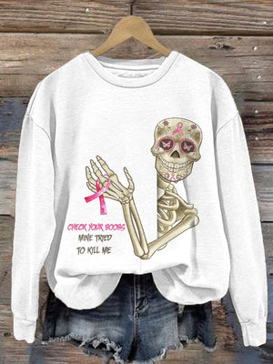 Retro Breast Cancer Awareness Skull Check Your Boobs Mine Tried To Kill Me Print Sweatshirt
