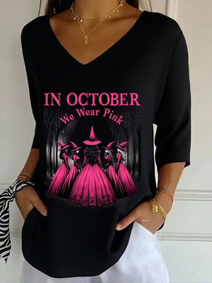 Retro October We Wear Pink Witch Breast Cancer Awareness Printed T-Shirt
