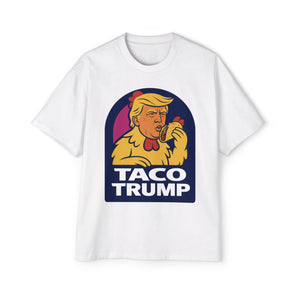 This design hits hard and looks even better. The artwork shows Trump’s face on a giant yellow chicken suit, complete with his signature comb-over, mid-bite into a taco. The background’s shape, color scheme, and structure mirror the famous Taco Bell logo, giving the satire a fast-food punch that’s impossible to ignore. Beneath the image, the bold text reads: TACO TRUMP—both a name and an accusation.