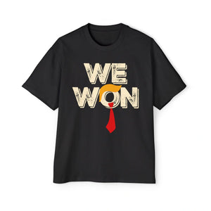 The shirt features the bold phrase “We Won,” emphasizing the sentiment among Trump’s supporters. The unique design takes it a step further, creatively using Trump’s signature hair and red tie in place of the letter ‘O’ in “Won.” This fun yet striking detail adds a playful nod to Trump’s iconic look while reinforcing the message of triumph.