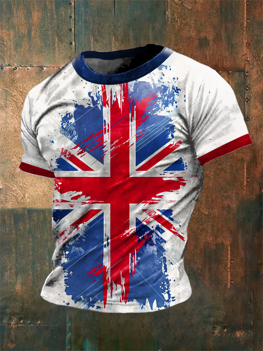 Unisex Vintage British Flag Patchwork Design Abstract Print Casual Cotton Short Sleeve T-Shirt