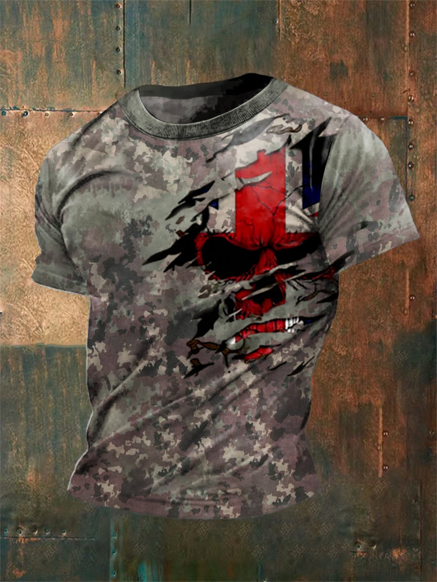 Unisex Vintage Veteran Camouflage Skull UK Flag Abstract Print Casual Cotton Short Sleeve T-Shirt