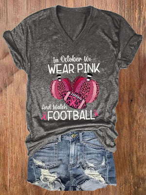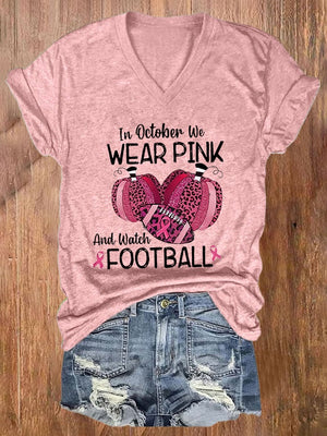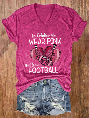 V-neck Breast Cancer Awareness In October We Wear Pink And Watch Football Print T-Shirt