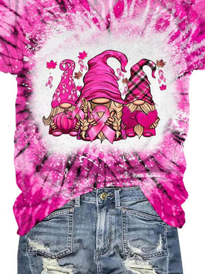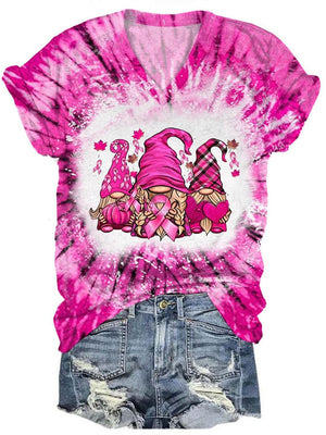 V-Neck Breast Cancer Awareness Tie Dye Gnomes Print T-Shirt