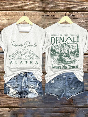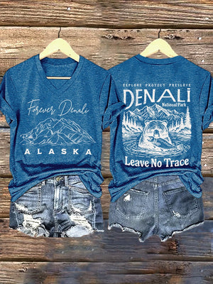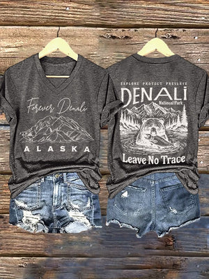 V-neck Retro Explore Protect Preserve Denali National Park Leave No Trace Forever Denali Alaska Print T-Shirt