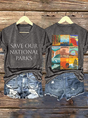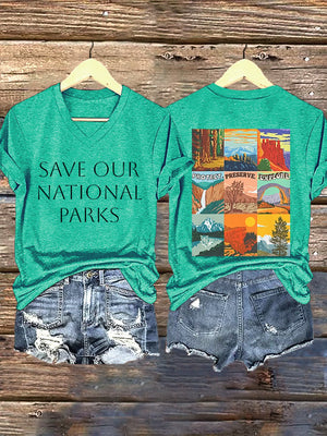 V-neck Retro Save Our National Parks Protect, Preserve, Explore Print T-Shirt