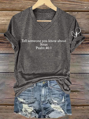 V-Neck Retro Tell Someone You Know About Jesus Psalm 46:1 Print T-Shirt