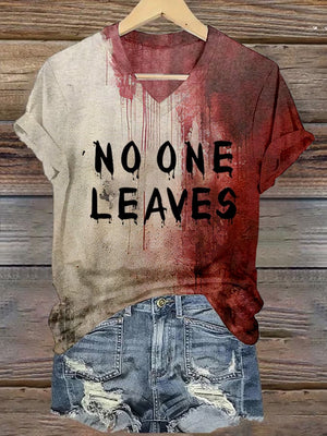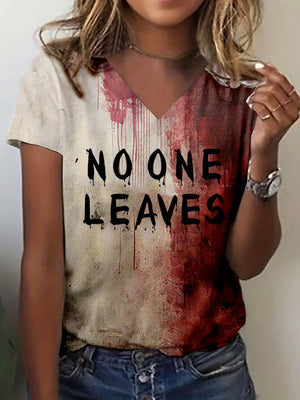 Women's Bloody No One Leaves Halloween Print V-Neck T-Shirt