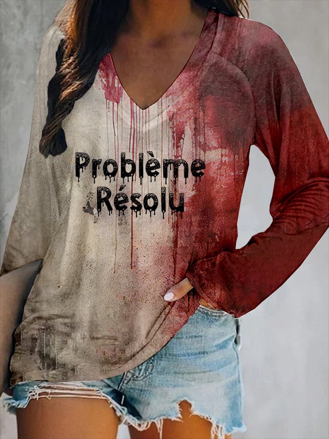 Women's Bloody Problem Solved Halloween Print V-Neck T-Shirt