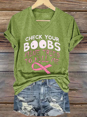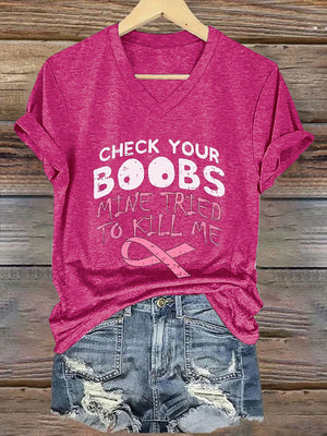 Women's Breast Cancer Awareness Printed Casual V-Neck T-Shirt